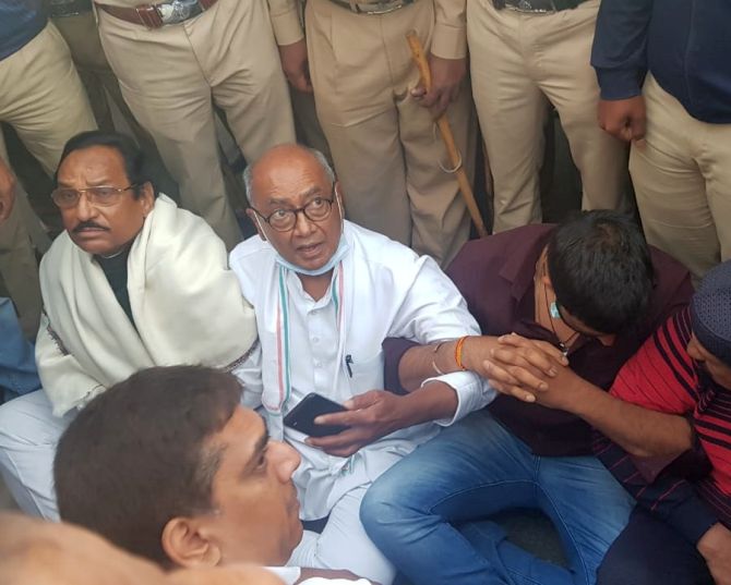 New Delhi, March 18 (PTI): High drama unfolded on Wednesday morning near the resort where rebel Congress MLAs from Madhya Pradesh are staying, as senior party leader Digvijay Singh staged a protest accusing the