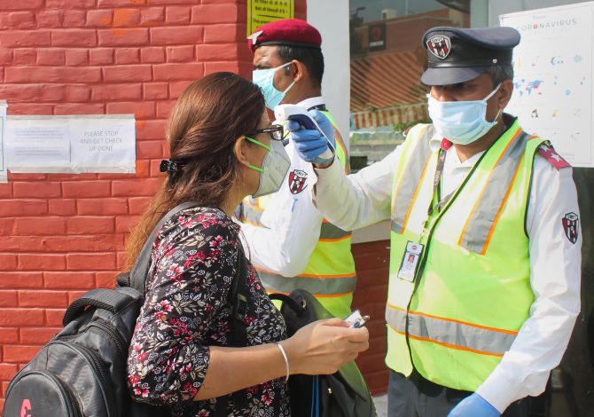 An official uses a thermal screening device on an employee in the wake of deadly coronavirus, at the entrance of corporate centre in Faridabad, Thursday, March 19, 2020. (PTI Photo