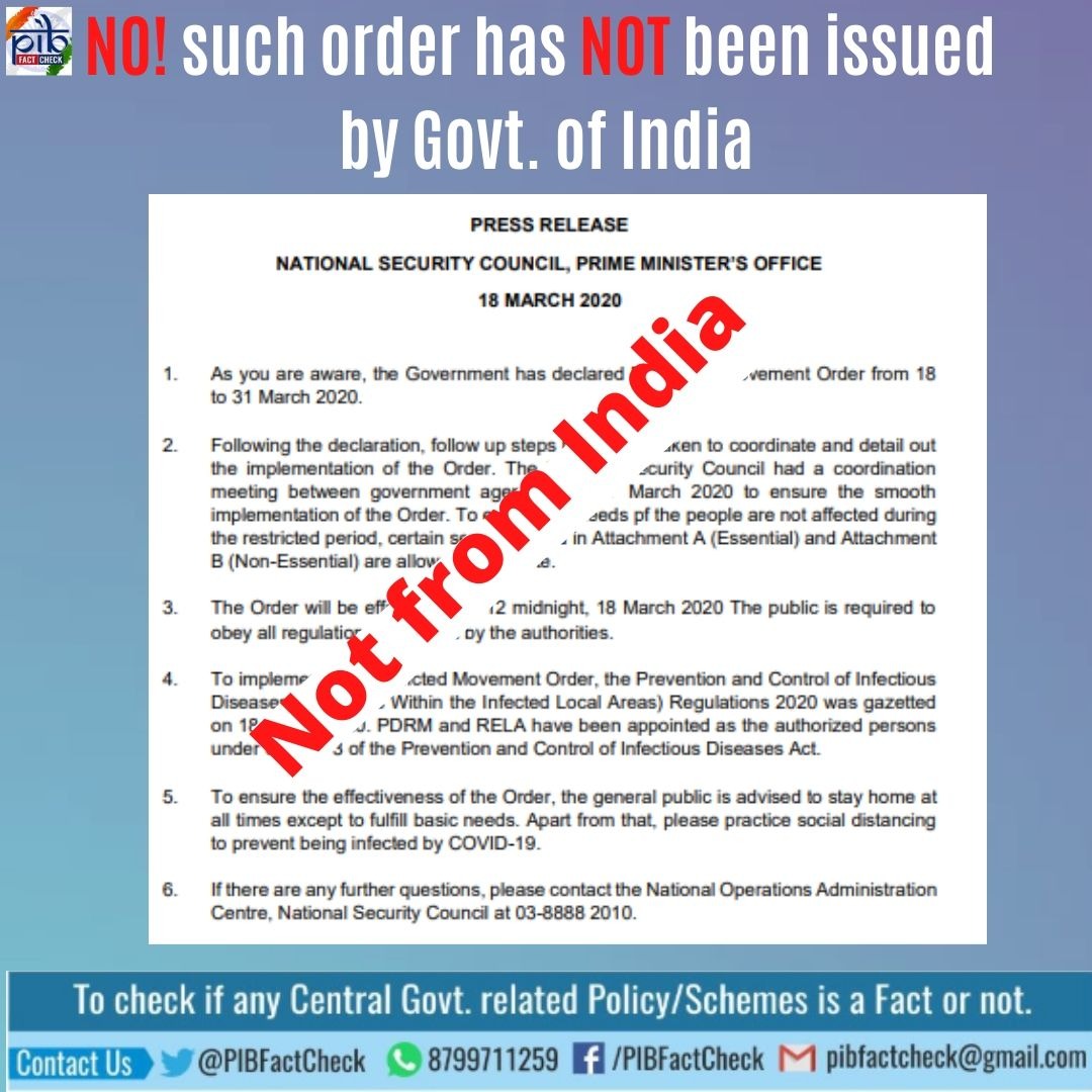 PIB Fact Check clarified Thursday evening that the PMO India has not issued any order the regarding movement restriction in the country due to COVID-19 (Image Courtesy: @PIBFactCheck/Twitter)