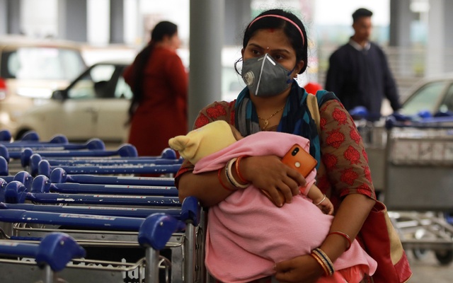 A passenger wearing a protective mask holds a baby as she waits outside an airport following an outbreak of the coronavirus disease (COVID-19), in New Delhi, India, Mar 14, 2020. REUTERS