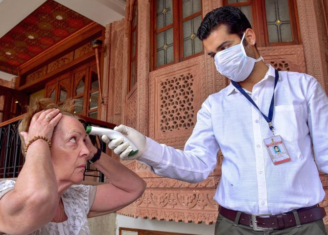 A medic checks the temperature of a tourist as part of precautionary screening in the wake of the novel coronavirus outbreak, at a hotel in Bikaner, Thursday, March 12, 2020. (PTI Photo)