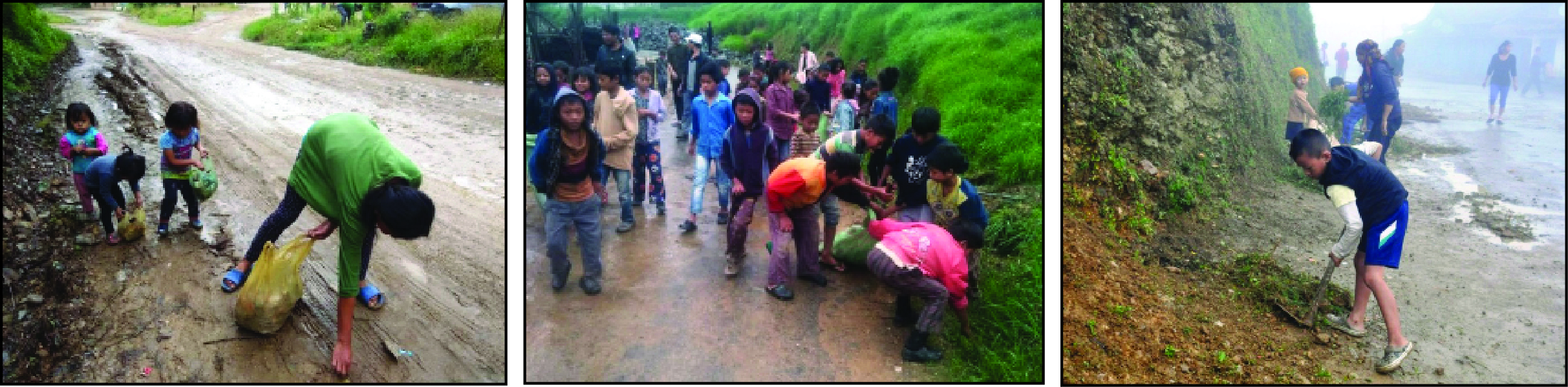 (Left) Three little children pick up litters on the road side in a village under Chozuba Sub division in Phek on October 2. (Center) Students of GPS-B Shamator take part in the mass social work at Shamator on O