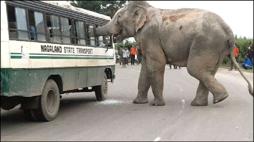 An adult elephant stopped traffic on national highway for a couple of hours at Khatkhati, Assam, Monday afternoon. Onlookers said the elephant, probably a wild one, looked famished and came out to forage for fo