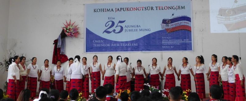Women folks presenting a cultural item during the celebration of Kohima Japukongtsur Telongjem Silver Jubilee held at Molu Ki on September 28.