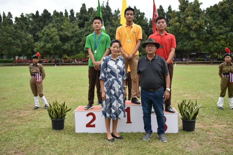 District sports officer, Dimapur, Tepulezonu Tetso (left) and Asa Khate, director Greenwood School, alongwith winners of the 100m race, the first event on the inaugural day of the school’s annual sports meet
