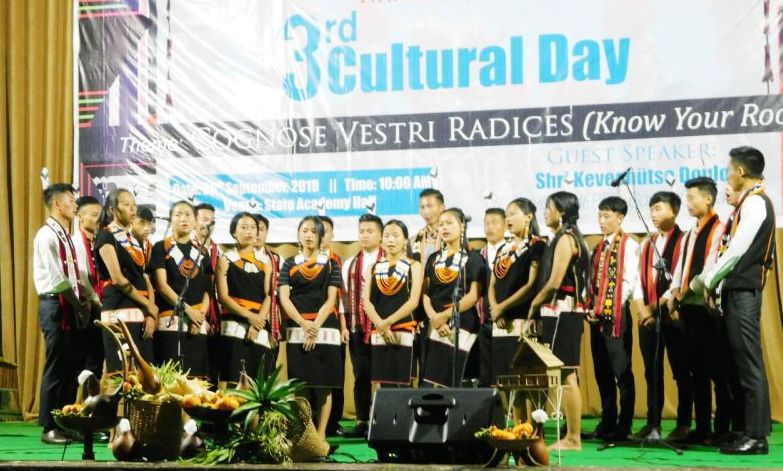 Students presenting a folk fusion during the 3rd Cultural Day of Capital college of Higher Education at the State Academy Hall held on September 26. (Morung Photo)