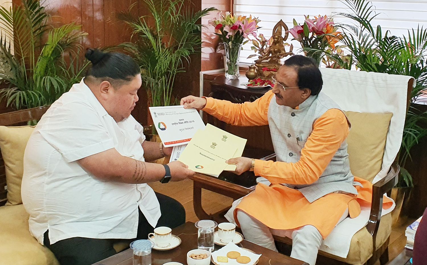 Nagaland State Minister for Higher & Technical Education and Tribal Affairs, Temjen Imna Along meets Union HRD Minister, Dr Ramesh Pokhriyal Nishank in New Delhi on September 4. (Photo Courtesy: PRO,