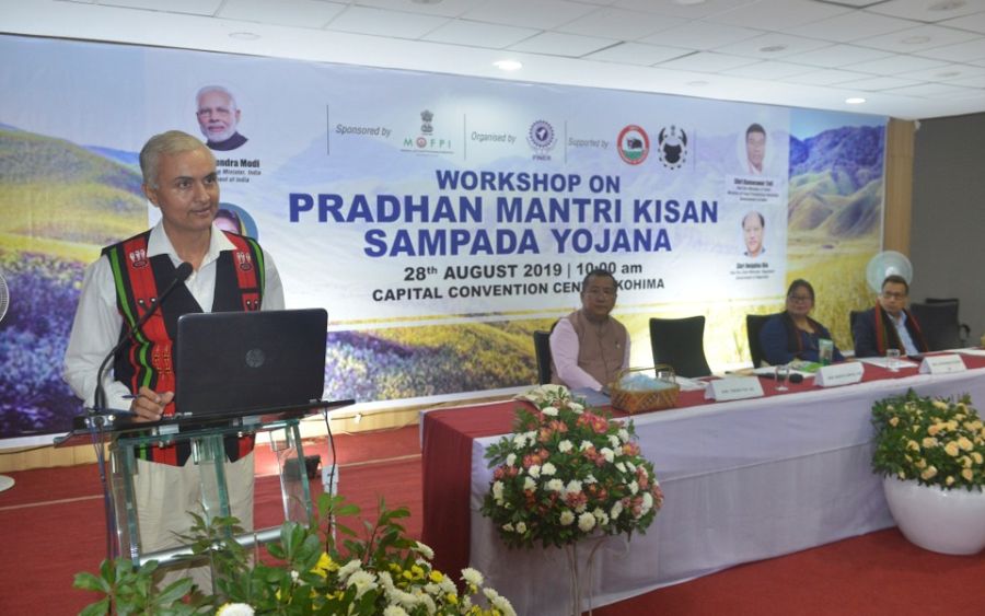 Additional Secretary, MoFPI, Dr Rakesh Sarwal addressing the workshop on Pradhan Mantri Kisan Sampada Yojna in Kohima on August 28. (DIPR Photo)