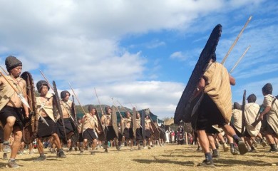 Zhavame youth perform Ri Doü (War Dance) during Thuni-Chakhesang festival at Zhavame village in Phek district on January 6. (Morung Photo)EMBODYING THE GRACE OF AGE AND CULTURE: A nonagenaria