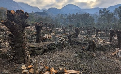 Coppices of pollarded stems from Alder trees harvested for firewood are seen neatly lined below the harvested trees at Khonoma village on January 5. Traditional alder based agroforestry system, considered an ec