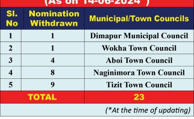 Morung Express NewsDimapur/Kohima | June 14 Following the withdrawal of nominations by 23 more intending candidates, the total number of aspirants for the upcoming June 26 elections to urban local bodies (