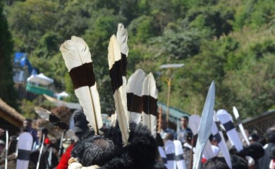 Participants of different cultural troupes adorning Hornbill feathers in their traditional head gear at the ongoing 24th Hornbill Festival in Naga Heritage Village, Kisama. (Morung Photo)Two elderly men f