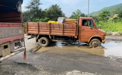 A small truck drives over the culvert with a ‘crater-like’ pothole on National Highway-29 Chümoukedima Town-Patkai Bridge stretch on August 10. (Morung Photo)