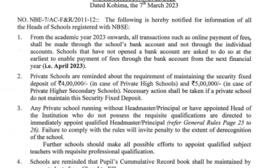 Kohima, March 8 (MExN): The NBSE, on March 7, all transactions such as online payment of fees must be made only through the school's bank account, not individual accounts from the next financial year (i.e.