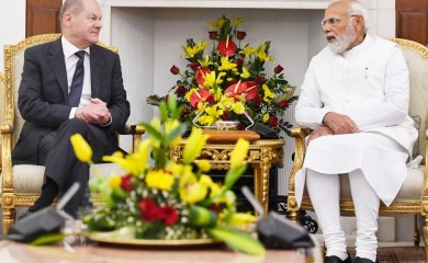 New Delhi, February 25 (IANS) Prime Minister Narendra Modi on Saturday gifted a 'Meghalaya Stole' and a 'Nagaland Shawl' to German Chancellor Olaf Scholz who is on a two-day visit to India.