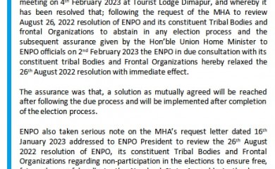 Dimapur, February 4 (MExN): The Eastern Nagaland People’s Organisation (ENPO) has decided to withdraw its assembly election boycott call as the Union Home Minister has reportedly assured that a mutually a