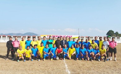 Players of Kohima District Football Association and Morning Premier League with officials during football exhibition match on 77th Republic Day celebration at Nagaland Civil Secretariat Plaza, Kohima on January