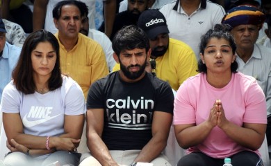 New Delhi, April 24 (IANS) Olympian wrestlers Bajrang Punia, Sakshi Malik, Vinesh Phogat and other top Indian grapplers, who restarted their protest against WFI chief Brij Bhushan Sharan Singh, spent Sunday nig