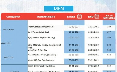 New Delhi, July 3 (IANS): The Indian men's domestic cricket season, also including Ranji Trophy which was cancelled last season due to Covid-19 pandemic, will commence on October 20 and run till March 26, 2