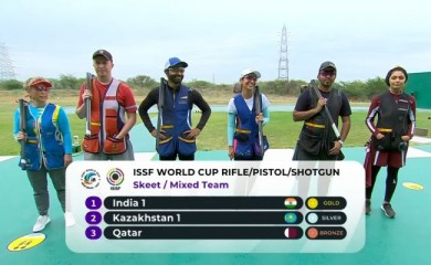 New Delhi, March 23 (IANS): India's Angad Vir Singh Bajwa and Ganemat Sekhon on Tuesday won gold in the skeet mixed team event of the Shooting World Cup here. The pair beat Kazakhstan's Olga Panarina an