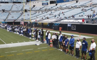 (Reuters): National Football League players staged pregame protests from coast-to-coast on Sunday, taking a knee during the playing of the U.S. national anthem in mostly empty stadiums, avoiding the embarr