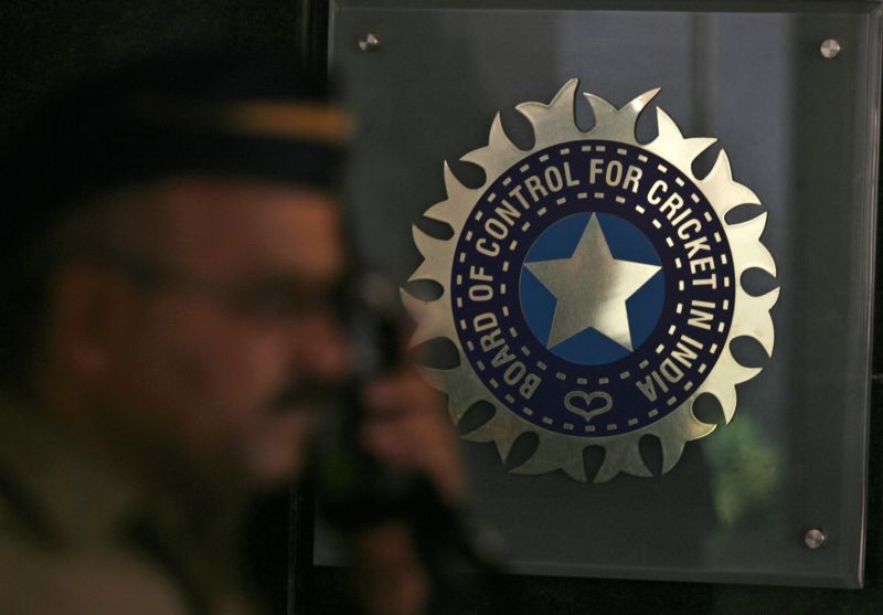 A policeman walks past a logo of the Board of Control for Cricket in India (BCCI) during a governing council meeting of the Indian Premier League (IPL) at BCCI headquarters in Mumbai April 26, 2010. REUTERS/Ark