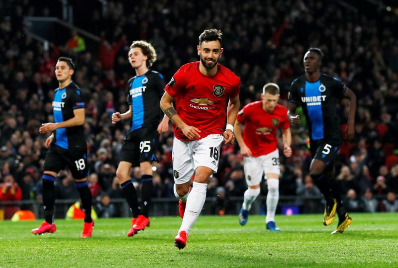 Soccer Football - Europa League - Round of 32 Second Leg - Manchester United v Club Brugge - Old Trafford, Manchester, Britain - February 27, 2020 Manchester United's Bruno Fernandes celebrates scoring their fi