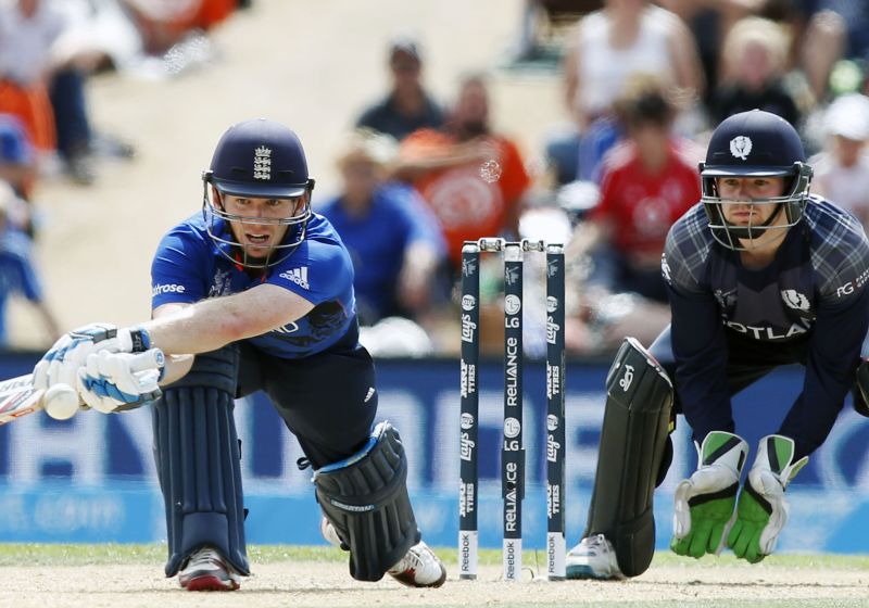 FILE PHOTO: England batsman Eoin Morgan plays a reverse sweep shot watched by Scotland's Matt Cross (R) during their Cricket World Cup match in Christchurch, February 23, 2015. REUTERS/Nigel Marple