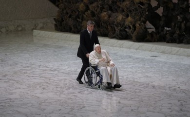 Vatican City, May 5 (AP) Pope Francis has arrived at an audience in a wheelchair as his knee pain continues to limit his mobility.