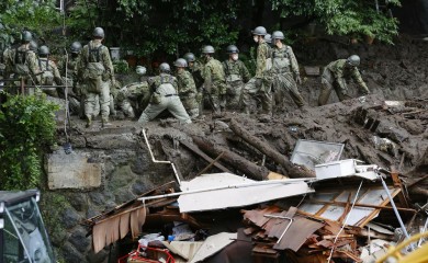 Atami (Japan), July 4 (AP): More than 1,000 soldiers, firefighters and police on Sunday waded through a giant mudslide that ripped through a resort town southwest of Tokyo, killing at least two people and leavi
