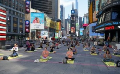 New York, June 21 (IANS): Rising from the pall of Covid-19 restrictions, New York City celebrated International Yoga Day at the Times Square with day-long performances of the ancient Indian art of developing a