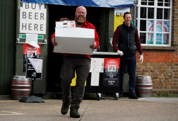 NHS staff with a food package at McMullen's brewery in Hertford, Natalie Payton and Lee Brooks offer a food collection service to all NHS staff, following the outbreak of the coronavirus disease (COVID-19), Her