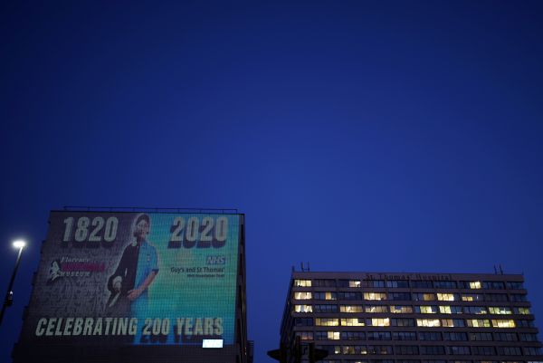To commemorate the bicentenary of Florence Nightingale's birth an image of her and a message in support of the NHS is projected at St Thomas' Hospital, following the outbreak of the coronavirus disease (COVID-1