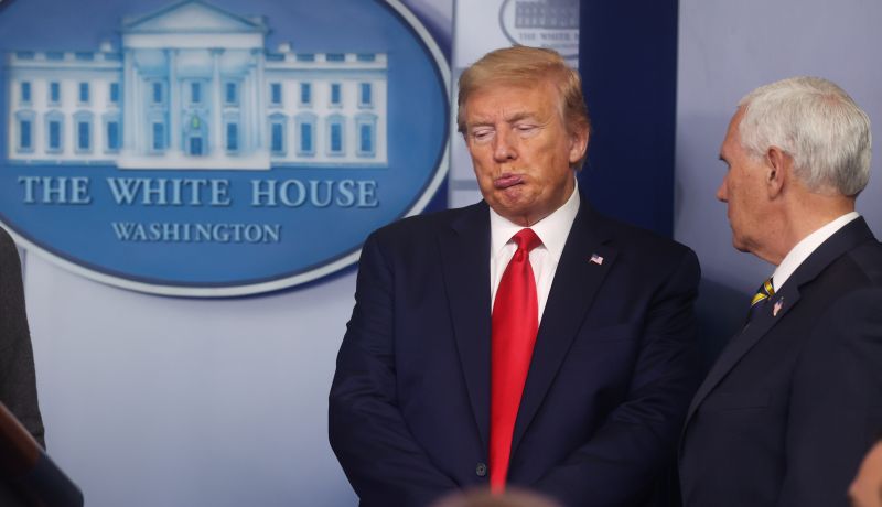 U.S. President Donald Trump reacts to a comment from Vice President Mike Pence as he talks with the vice president during the daily coronavirus task force briefing at the White House in Washington, U.S., April