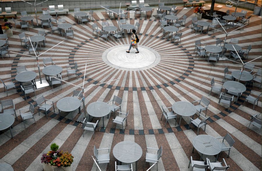 A woman walks through an almost empty outdoor restaurant after the government announced the extension of the state of emergency, which had already been declared for the capital and some prefectures, to the whol