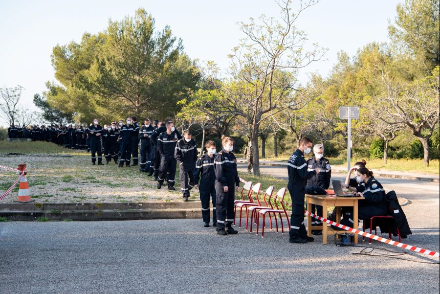 Medical staff of the French Army and Marseille firefighters do tests for coronavirus disease (COVID-19) to sailors of French aircraft carrier Charles de Gaulle, who are confined at the Pole Ecoles Mediterranee