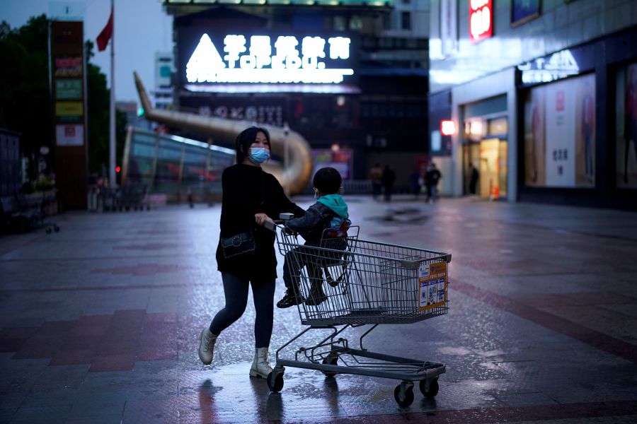 A woman wearing a face mask pushes a shopping trolley with a child sitting on it outside a shopping mall in Xianning of Hubei province, the epicentre of China's coronavirus disease (COVID-19) outbreak on M