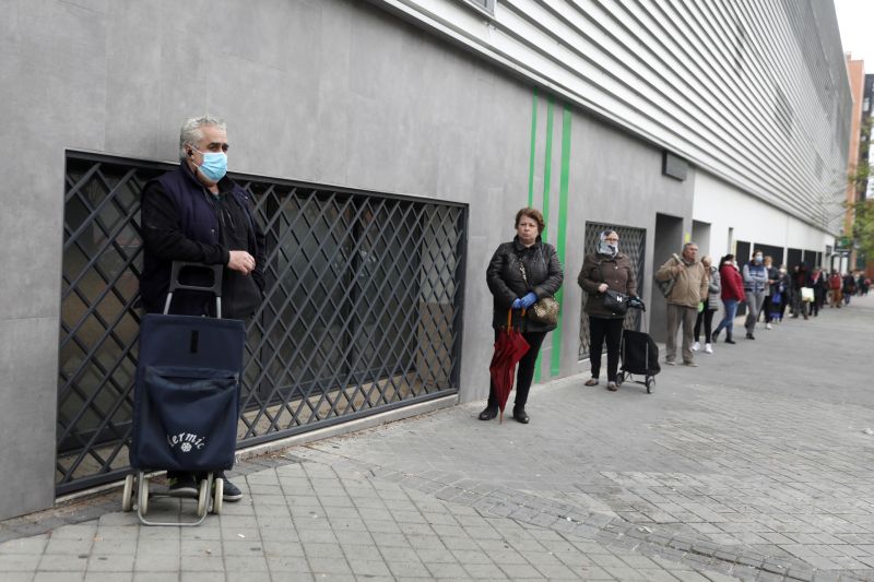People keep social distance as they wait to enter a supermarket amid the coronavirus disease (COVID-19) outbreak in Madrid, Spain April 14, 2020. REUTERS/Sergio Perez