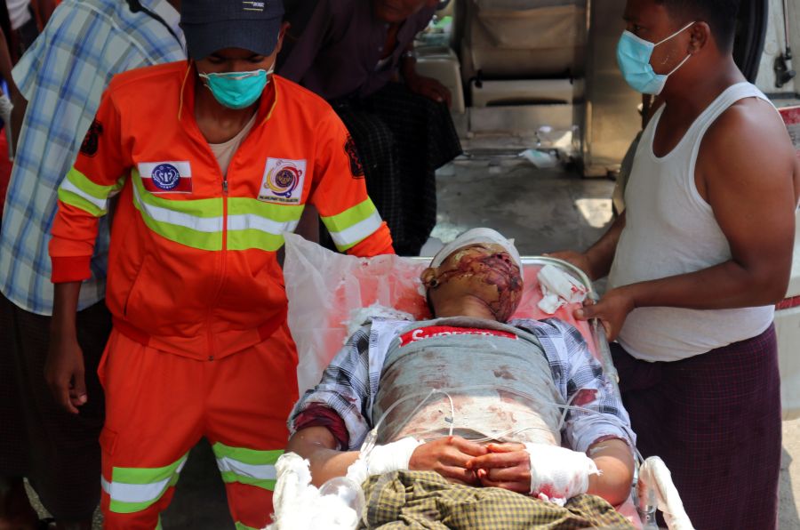 A man who, according to the villagers, was wounded in a shelling arrives at Sittwe General Hospital in Rakhine State, Myanmar on April 13. (REUTERS Photo)