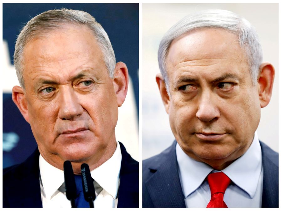 A combination picture shows Benny Gantz, leader of Blue and White party, in Tel Aviv, Israel, November 23, 2019 and Israeli Prime Minister Benjamin Netanyahu in Kiryat Malachi, Israel on March 1, 2020. (REUTERS