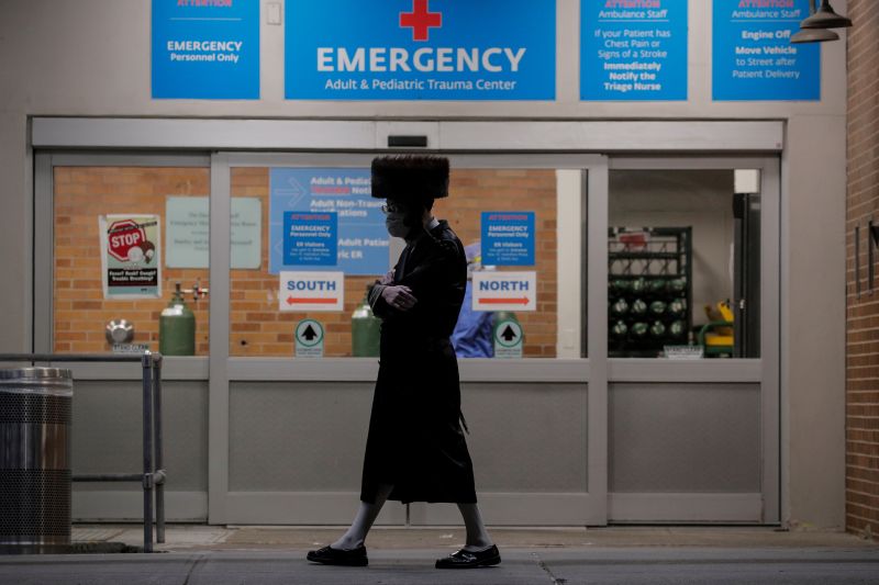 A member of the Hasidic Jewish community walks outside the emergency center at Maimonides Medical Center during the outbreak of the coronavirus disease (COVID19) in the Brooklyn borough of New York, U.S., April