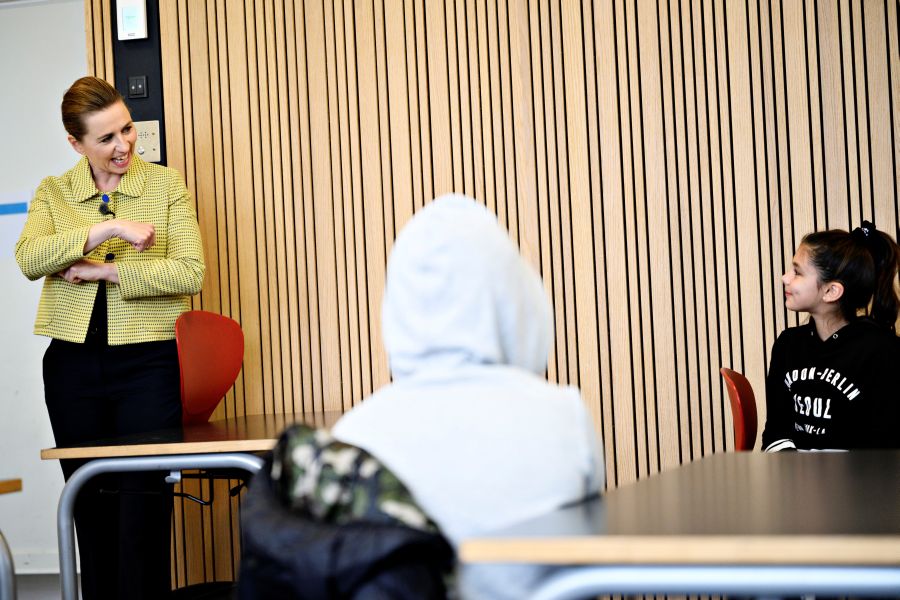 Danish Prime Minister Mette Frederiksen speaks with pupils as she participates in the reopening of Lykkebo School in Valby, after its lockdown due to the coronavirus disease (COVID-19) spread, in Copenhagen, De