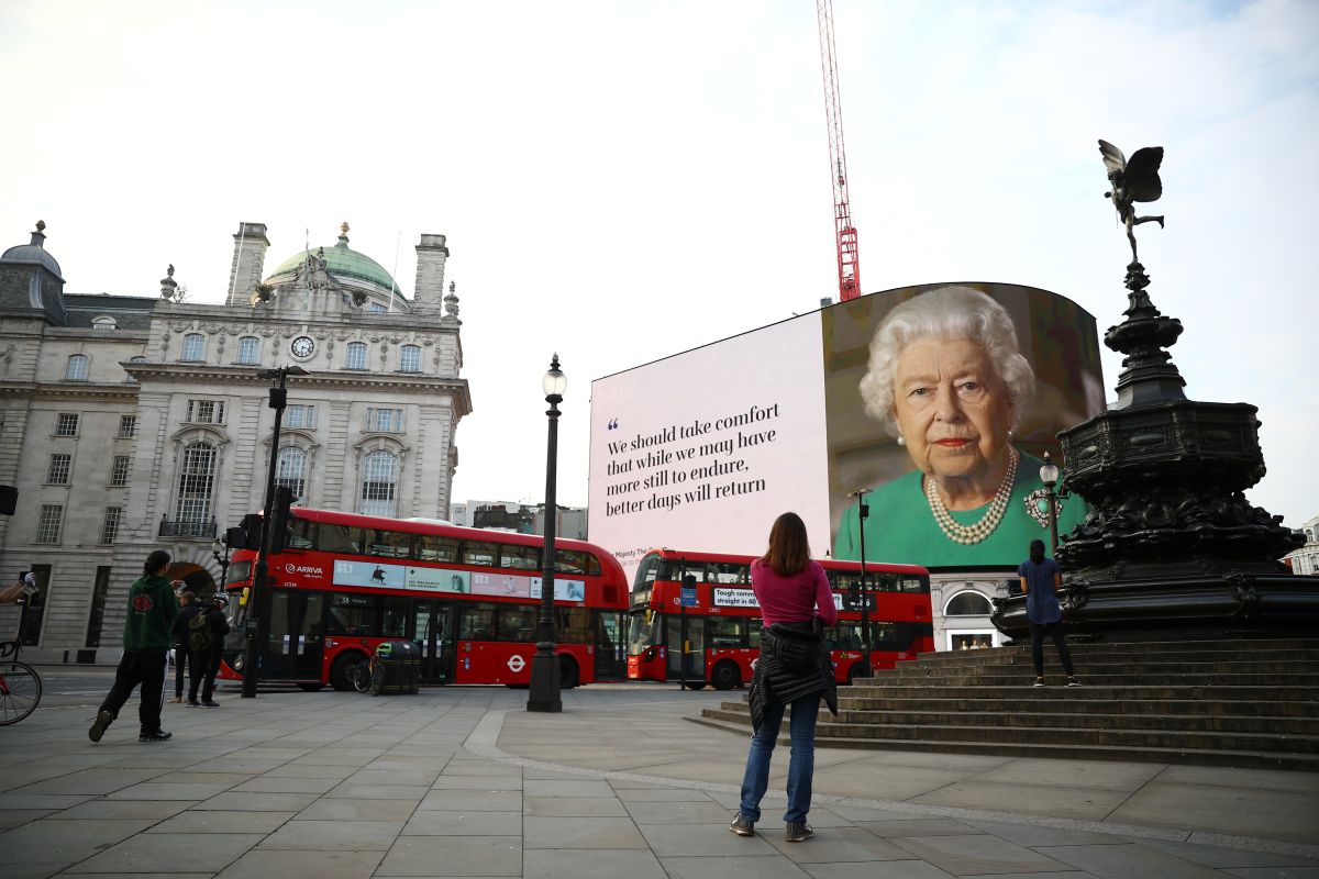 A message from Britain's Queen Elizabeth II is displayed on a screen in Piccadilly Circus, as the spread of the coronavirus disease (COVID-19) continues, London, Britain, April 8, 2020. REUTERS/Hannah McKay/Fil