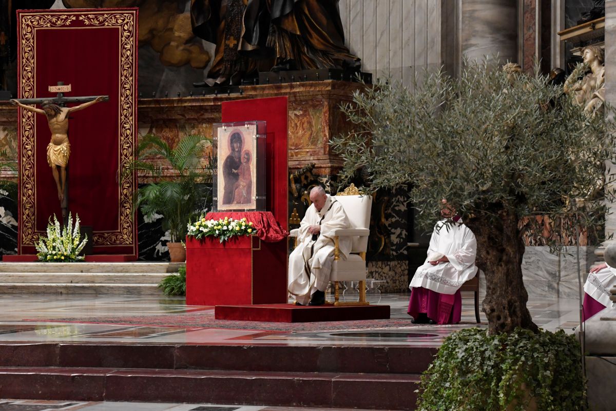 Pope Francis leads the Easter vigil Mass in St. Peter's Basilica with no public participation due to the outbreak of the coronavirus disease (COVID-19) at the Vatican, April 11, 2020. Vatican Media/Hando