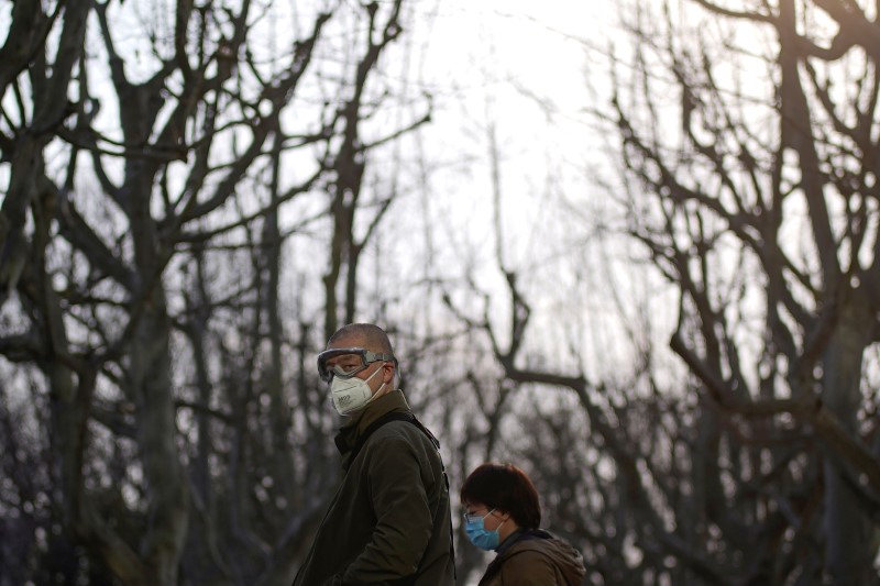 People wear face masks near a bus stop on a street following an outbreak of the coronavirus disease (COVID-19), in Beijing, China March 30, 2020. REUTERS/Carlos Garcia Rawlins