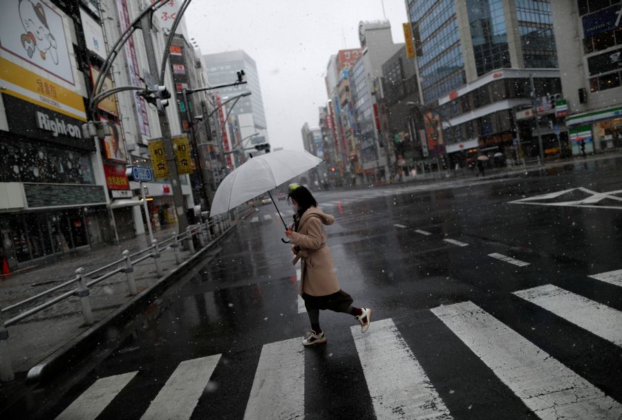 A woman wearing a protective face mask, following an outbreak of the coronavirus disease (COVID-19), walks past on a nearly empty street in a snow fall during the first weekend after Tokyo Governor Yuriko Koike