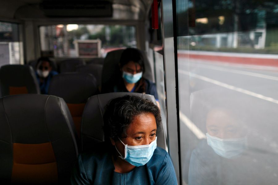 A medical worker wearing a protective mask rides a free shuttle service for healthcare workers following the suspension of mass transportation in Metro Manila to contain the spread of the coronavirus disease (C
