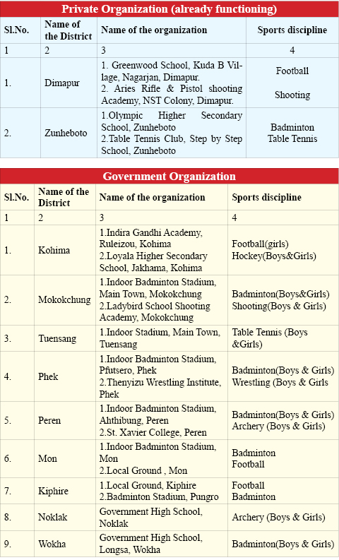 Kohima, October 12 (MExN): The Union Ministry of Youth Affairs & Sports has approved the setting up of the 19 Khelo India Centres in the Nagaland. The DIPR informed that the centres (See tables) were sanctioned in pursuance to a proposal submitted by the Department of Youth Resources & Sports, Nagaland.