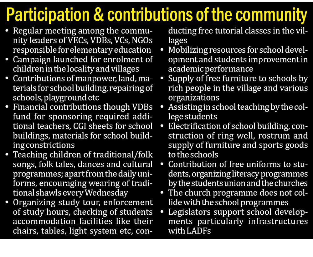 Elementary education, which was communitised in 2002 under the Nagaland Communitisation of Public Institutions and Services Act, 2002 is the largest and the most important sector of Government-Community partnership in the state, according to the Annual Administrative Report of the state’s school education department. The report was tabled by minister for school education C.M. Chang in the recently concluded assembly session.