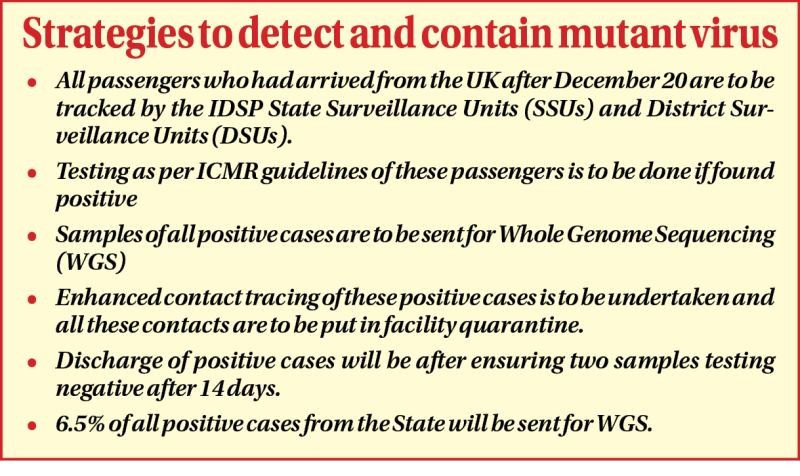 Genome sequencing of those who tested positive after coming to India from the UK is underway to see if they are carrying the mutant strain. The Indian SARS-CoV-2 Genomics Consortium (INSACOG) has been formed to expand whole genome sequencing across the nation.